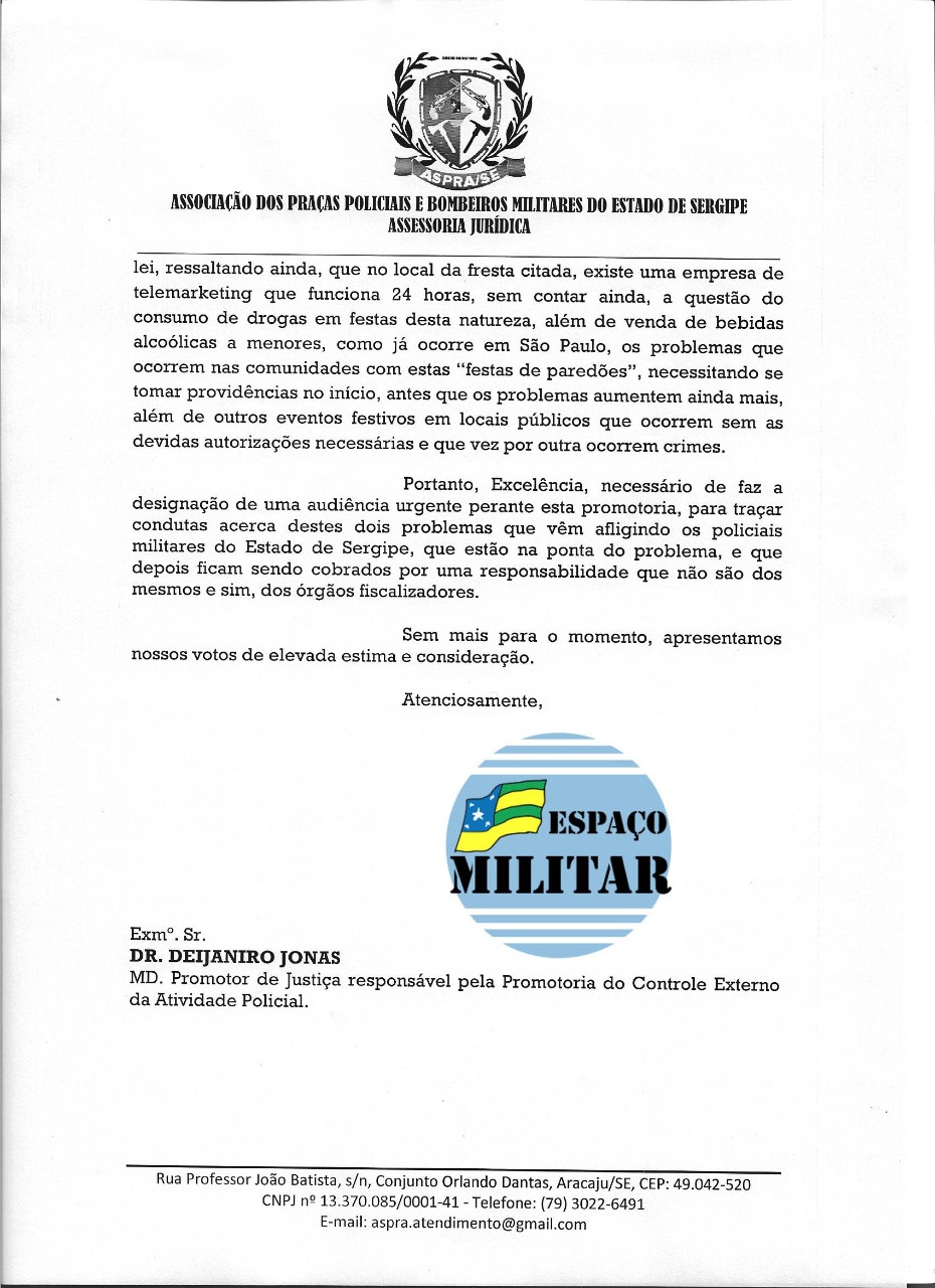 Desde já a ASPRA/SE agrade ao Promotor de Justiça Dr. Deijaniro Jonas pela presteza e atenção para buscar soluções para os problemas apontados.