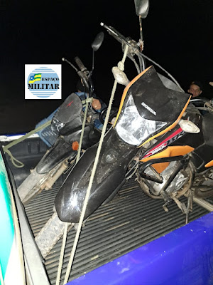 Imediatamente os militares se deslocaram até o local informado para averiguar a informação e ao chegarem ao local, visualizaram marcar de pneus de motocicleta no chão, que iam em direção a uma mata fechada, tendo os mesmos adentrado com cautela e segurança, localizando dois veículos tipo motocicleta,, sendo uma Honda Bros e uma Honda Pop 100, abandonados embaixo de uma árvore.